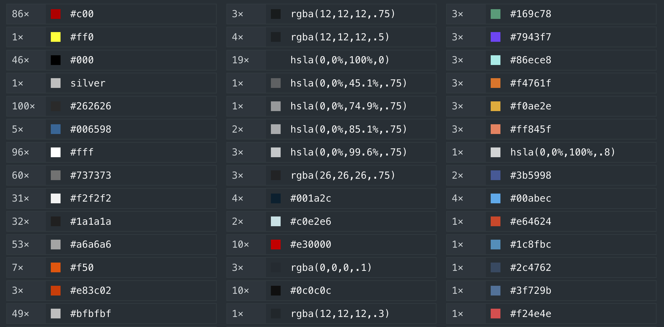 Somewhere down the page there are some colors lists. They’re basically a small <canvas> where we render all known colors too. For websites with many colors this can be quite intensive, so I gave this the same treatment as the ScatterPlots: only when the Colors section of the report is scrolled into view, these canvases are rendered.